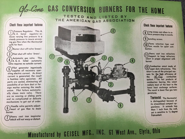 The cost to install a new Geisel Glo-Cone gas conversion burner was $165.00 complete. Out of that the salesman received $20.00. The installer received $17.50 ($22.50 if out of Lorain County) The Glo-Cone conversion burners were very popular because they continued to heat even if the power to the home went out, which at that time happened often.